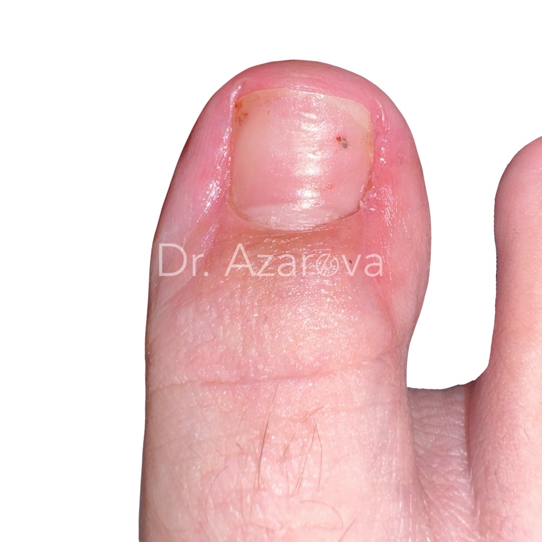 Первый этап: дискомфорт, раздражение, незначительная боль в области одного из углов ногтевой пластины, чаще наружнего угла, незначительная отечность и покраснение одного или обоих околоногтевых валиков;